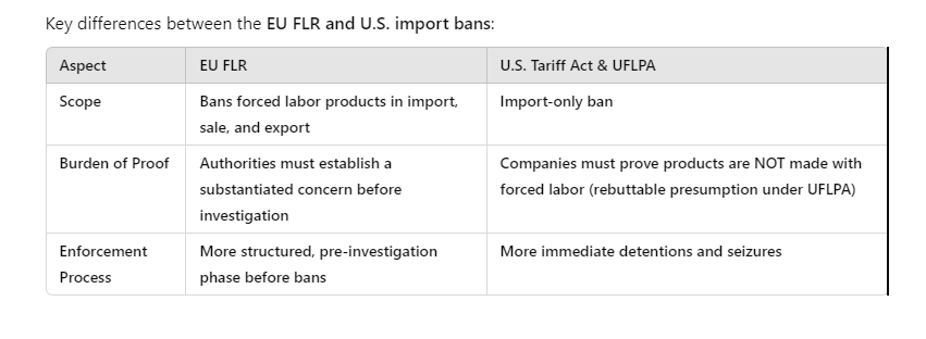 - Section 307 of the U.S. Tariff Act (1930): Prohibits goods made with forced labor from entering the U.S.